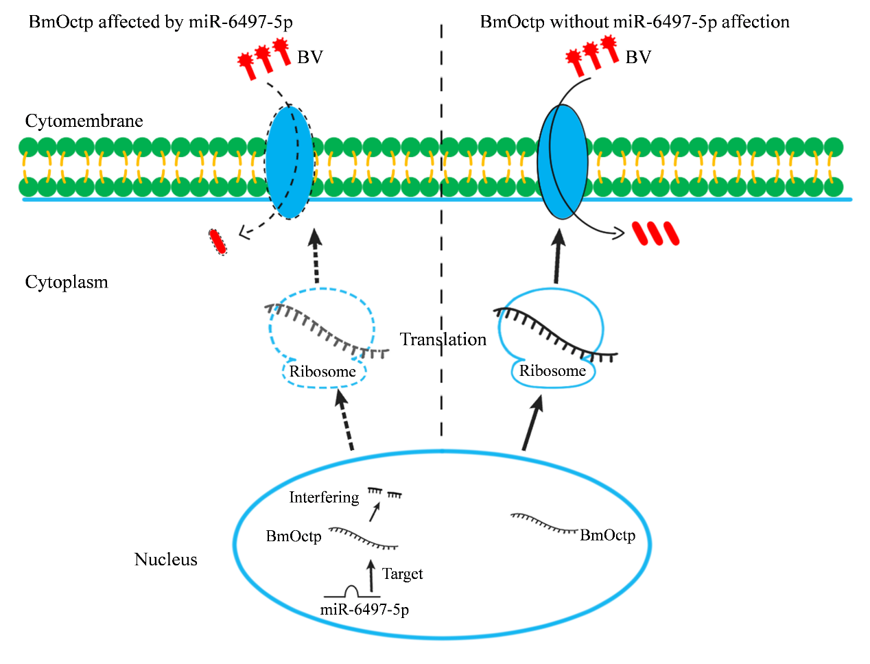 在《Insect Science》期刊上发表了题为“miR-6497-5p suppresses AcMNPV infection by targeting organic cation transport protein in silkworm, Bombyx mori”的研究论文,该研究首次系统性筛选出家蚕抵抗杆状病毒AcMNPV感染的核心miRNA——miR-6497-5p。该分子通过抑制家蚕阳离子通道蛋白(BmOctp)的表达,显著降低病毒侵入细胞的数量。第一作者为汪志盛博士。